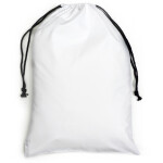 This bag is simple, humble and useful. It can be easily folded and tucked away and used for a multitude of purposes. It is made with 140gsm calico cotton and features drawstring closing.